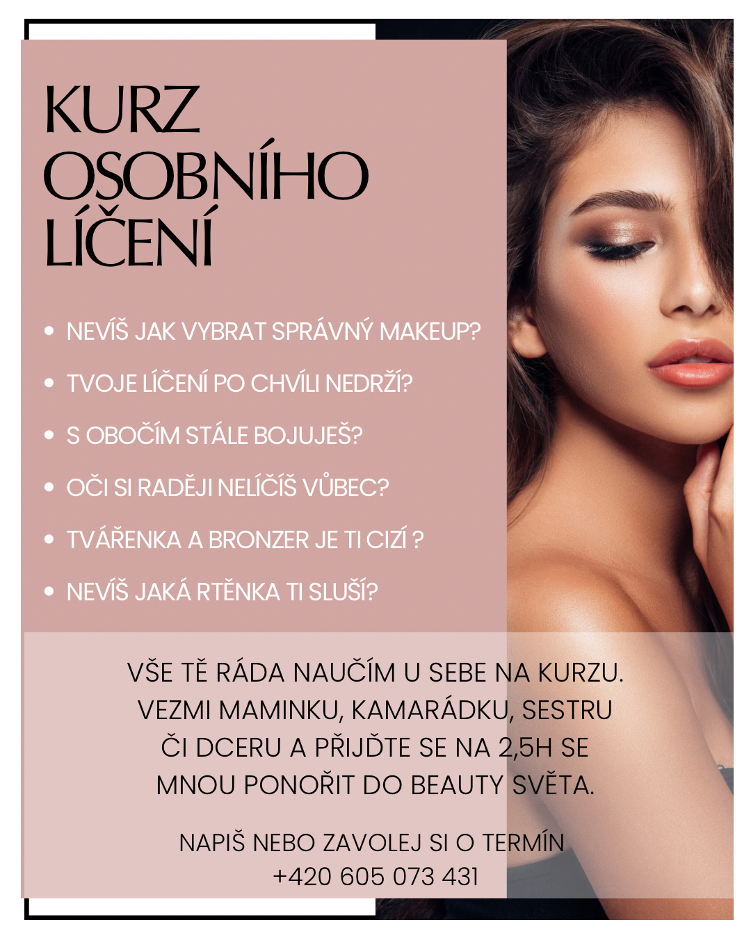 ráda bych Vás pozvala na svůj Kurz osobního líčení. Kurz je vhodný pro všechny ženy a dívky, které se chtějí umět pěkně upravit do školy, zaměstnání nebo třeba na ples.